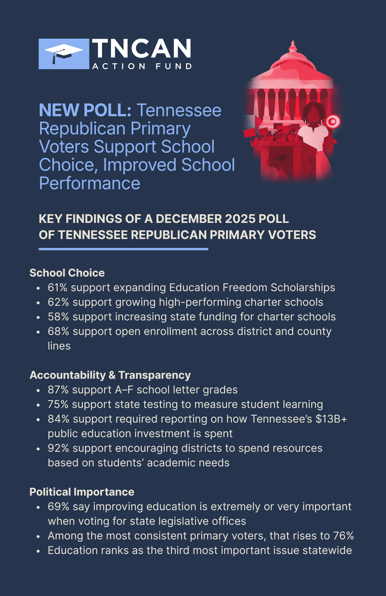 - 84% support required reporting on how Tennessee’s $13B+ public education investment is spent